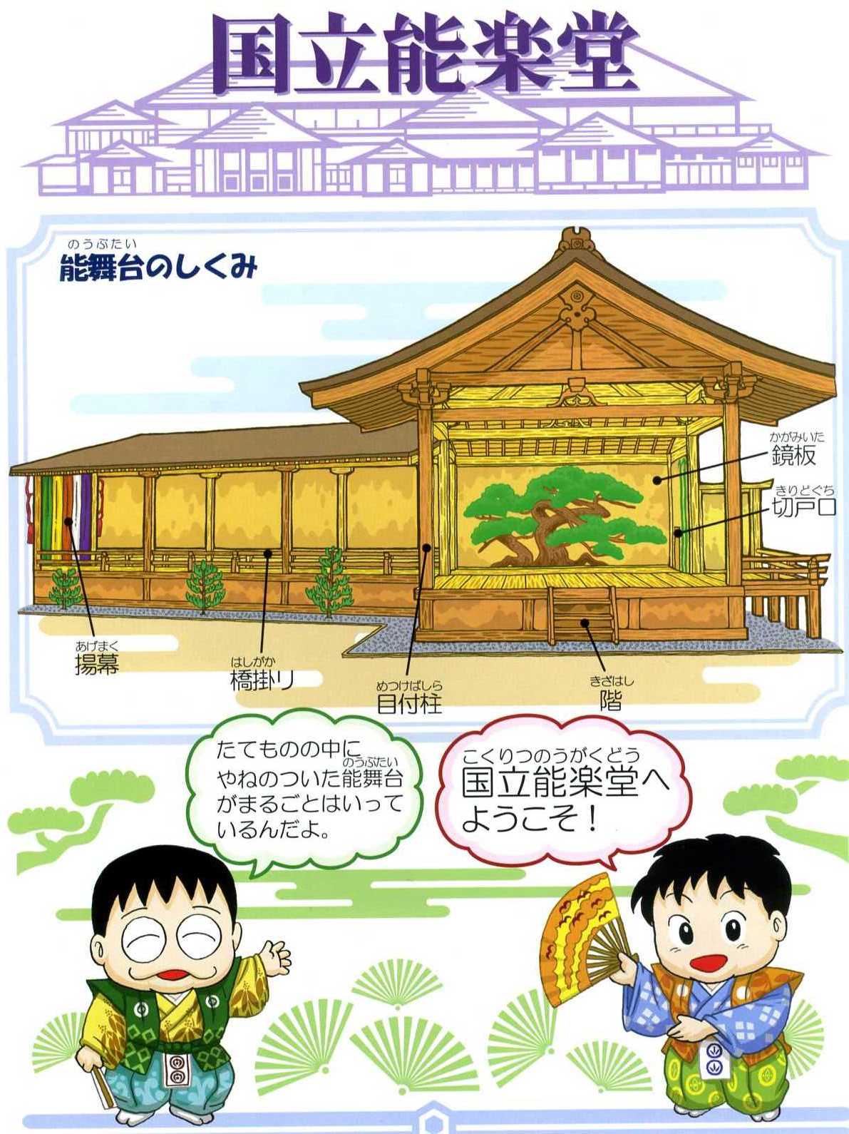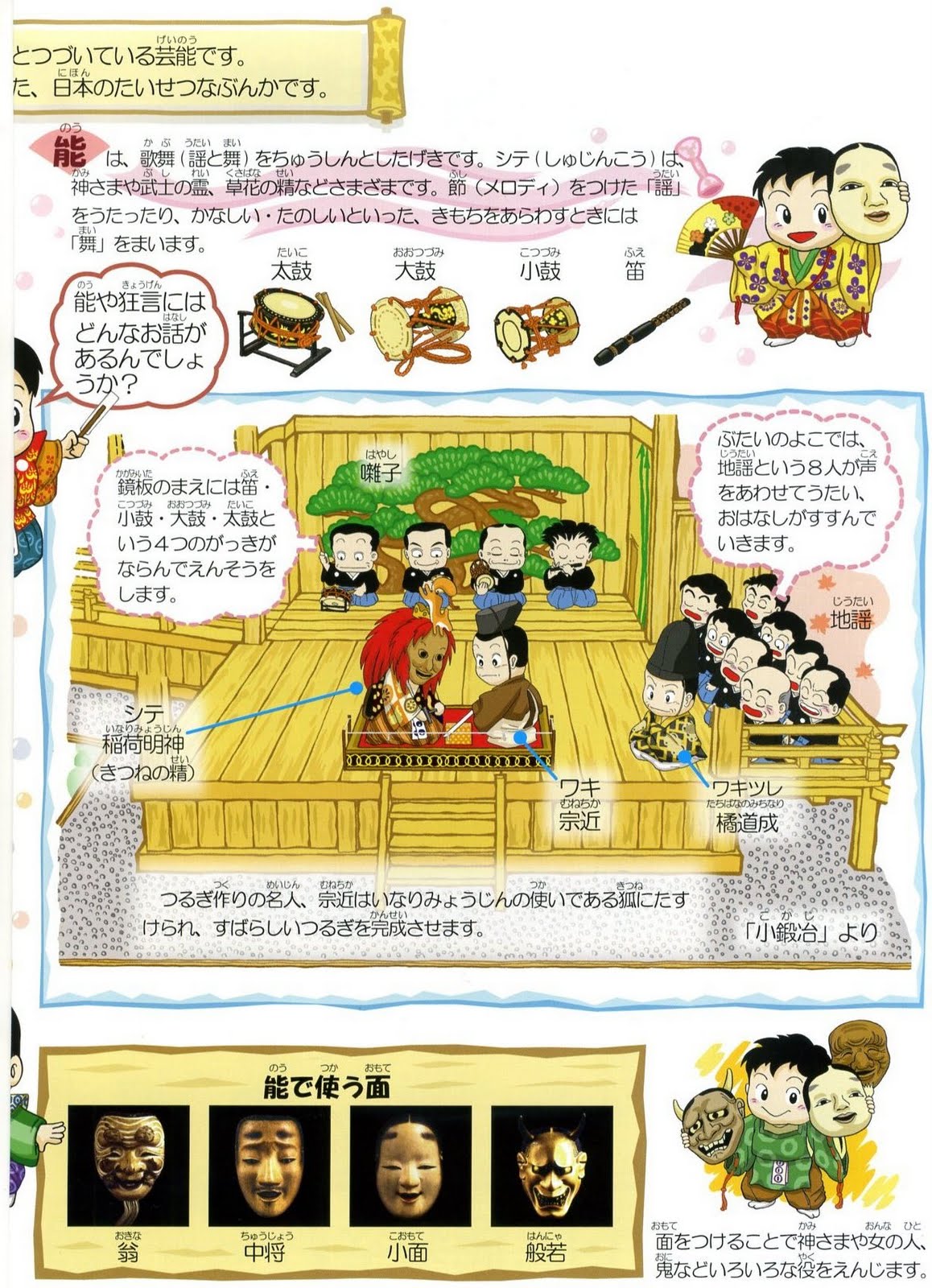 Both plays are very dynamic pieces in the repertoire and in fact resulted in a big success: kids (8 years old on the average) laughed out loud during Kaminari and jumped on their chairs during Kokaji, imitating fights with the magic sword. Children and parents had also the chance to try out instruments and masks in the theatre lobby. Among the cutest features of the day was the printed programme, introducing Noh and its elements in a deformed manga style. I loved this day at the National Noh Theatre as much as the kids did. How long before they lose their interest?