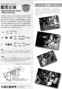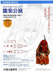 Among the various attempts at healing this broken bound, and reconnect with the lost audience are workshops, demonstrations, exhibitions, inviting non-habitual Noh theatregoers to give it a try. In summer 2008 I attended a most interesting Parents and Children Noh performance at the National Noh Theatre in Tokyo. The programme featured a funny and engaging introductory speech by a Kyogen actor, followed by the Kyogen Kaminari (‘The God of Thunder’) and the Noh Kokaji (‘The Fox Swordsmith’).