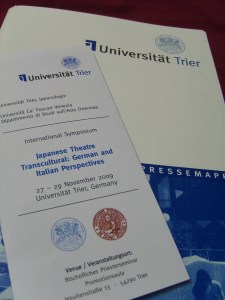 I am back from the Symposium Japanese Theatre Transcultural: German and Italian Perspectives held in Trier University in collaboration with Università Cà Foscari, Venice 27-29 November 2009. Thanks to a wonderful organisation and to the good-will of a good number of students from the Japanologie department (from Germany, Belgium, Japan, etc) the conference was a success and all participants were satisfied with the fruitful discussions on the theme of the encounter of Japanese theatre with Italy and Germany. Organisers Andreas Regelsberg and Stanca Scholz-Cionca did a great job, indeed.