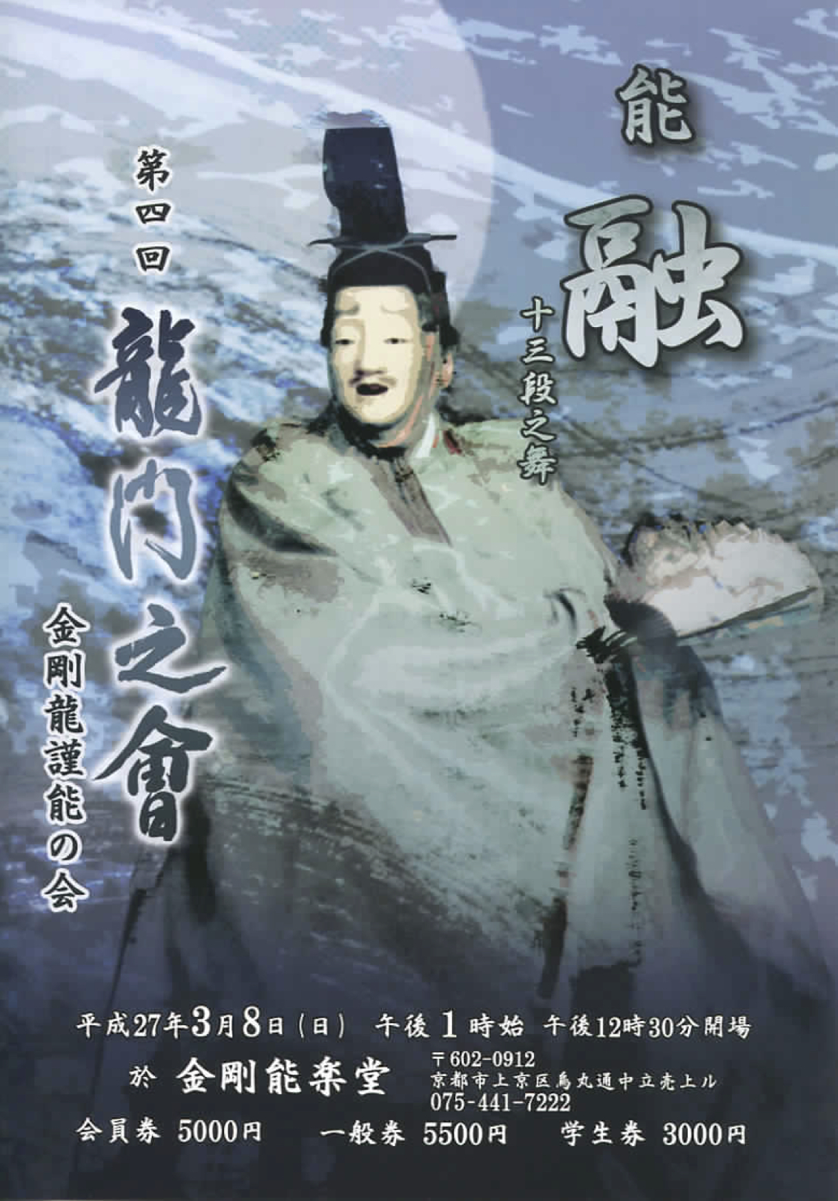 On Sunday 8th March 2015 at the Kongo Nogakudo, on the occasion of the fourth Ryumon no kai event, Kongo Tatsunori, son of the Iemoto Kongo Hisanori is going to perform the Noh Toru in the special variation Jusandan-no-mai.
