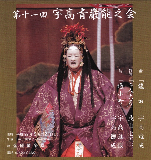 The Seiran-Noh (青蘭能) is a yearly performance at the Kongo Noh theatre in Kyoto featuring Udaka Michishige and his sons, Udaka Tatsushige and Udaka Norishige. Until now known as ‘Seigan Noh’, the event has recently changed its name into ‘Seiran’ honouring Udaka Michishige’s great-grandfather, painter Kawada Shoryo (1824-1898), who was closely related to Sakamoto Ryoma, one of the central characters in the Meiji restoration. Kawada’s favourite flower was the orchid (‘ran’ 蘭).