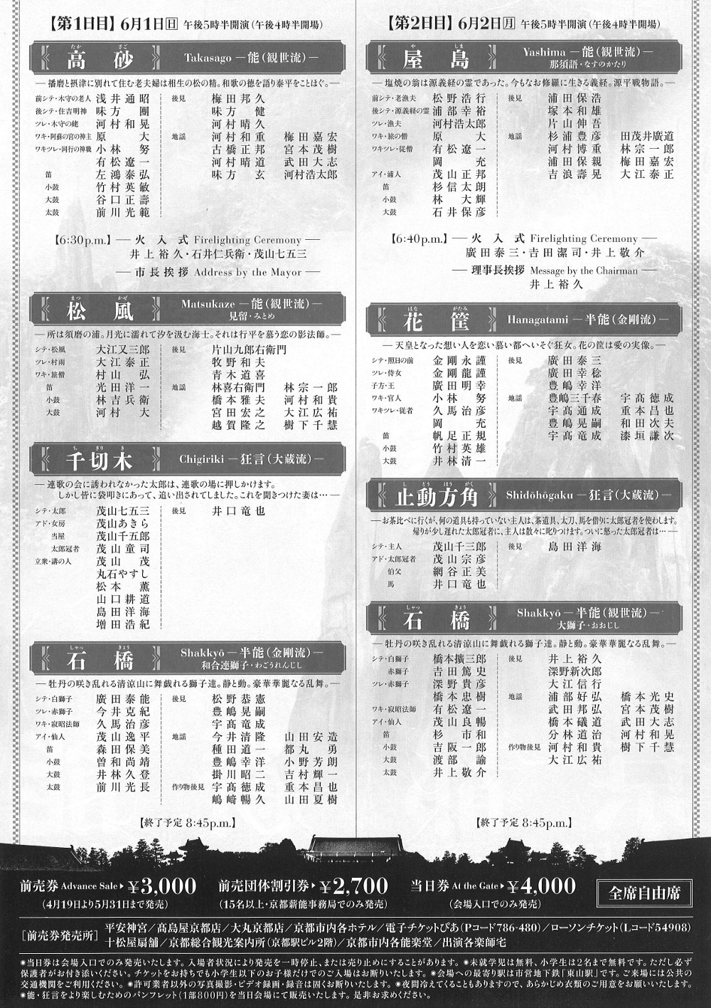 June 1 – Noh: Takasago (Kanze); Noh: Matsukaze (Kanze); Kyogen: Chigiriki (Okura); Noh: Shakkyō (Kongō).