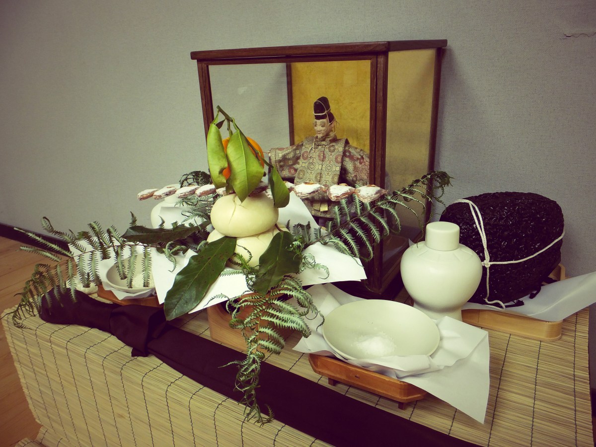Every year at this time of the year Udaka-sensei performs a brief ritual of purification of the butai, the stage on which he and his students practice during the rest of the year, at the okeikoba practice space. As you can see in the pictures, a small altar with an Okinadoll and various offerings (rice cakes, mandarins, uncooked rice, salt and rice wine, etc.) is set up at the back of the stage. During the ceremony omiki, a ceremonial sacred cup of wine, is also served. This ceremony derives from shinto practices associated with the New Year, where various places or objects are blessed or purified, getting ‘refreshed’ for the new year.
