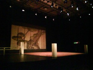 I didn’t dare taking pictures during the performance, however here is how the stage looked like before it began. One of the most interesting aspects of the performance was the hanging scroll-like matsubame, painted by Nihonga artist Allan West.