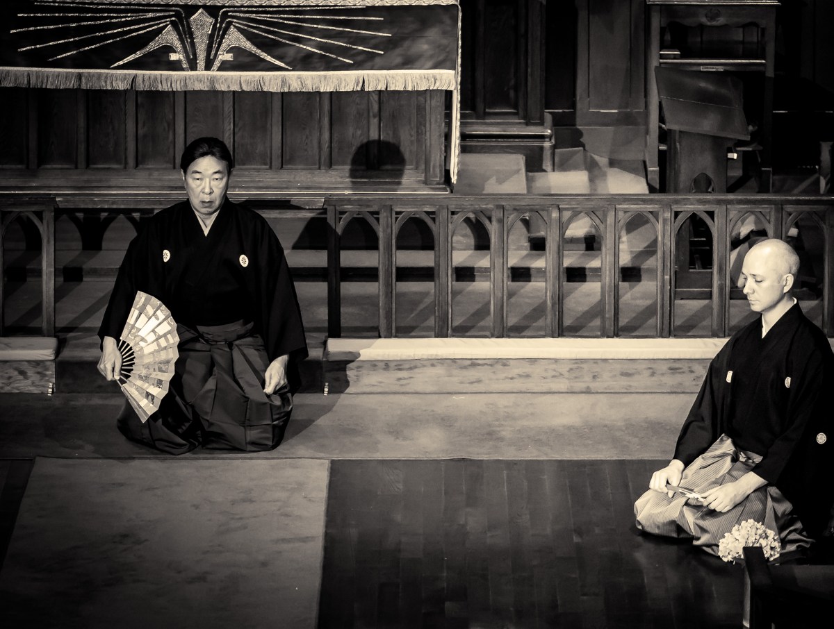 The chorus for Kami-uta, the recitation of the chant from the ritual performance Okina, often performed at the beginning of celebrations such as an important birthday. Difficulties: here Kami-uta serves as ‘opening ritual’ – we will perform with formal kamishimo. It is an honour for me to partake in this recitation.